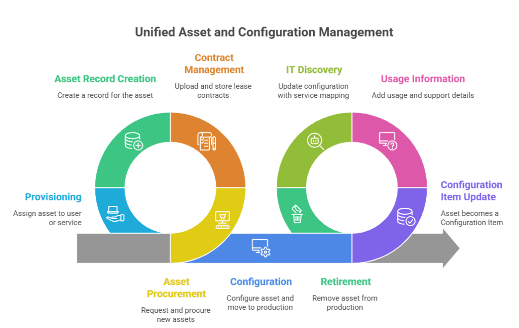 ITIL asset and configuration management principles cover the entire asset lifecycle, from procurement or lease through assignment, ongoing operations, and eventual retirement. ITAM tracks each asset’s location and usage throughout, and it manages proper depreciation of capital assets along the way.