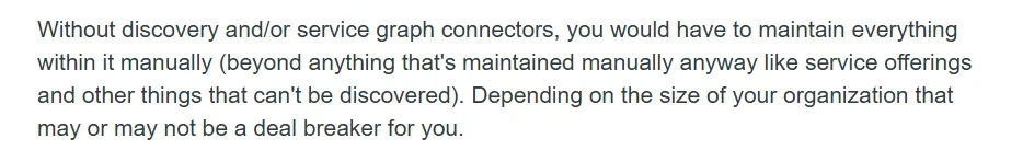 Another downside is maintenance. Many IT pros note that keeping ServiceNow CMDB up-to-date is a full-time job. Without ongoing attention, data can become outdated fast, leading to poor trust and adoption across teams.