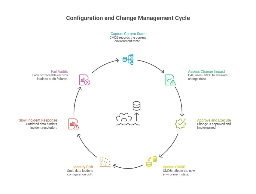Configuration management lays the groundwork. Before anyone proposes a change, you need an accurate map of your environment: what assets exist, how they’re configured, and what depends on what. Without that baseline, change management is guesswork.