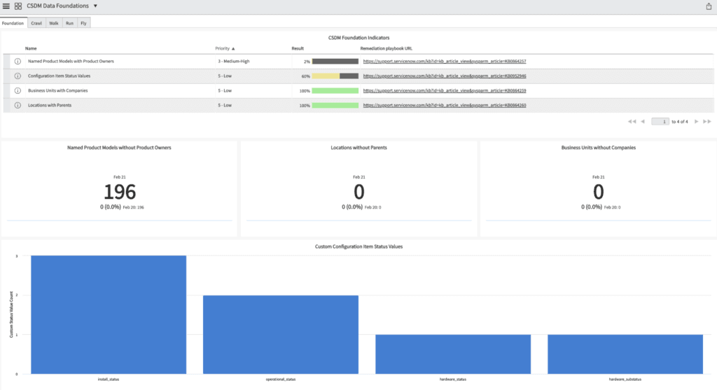 ServiceNow includes built-in tools to assess CMDB health — monitoring completeness of CI records, correctness of CI attributes, and compliance with modeling standards. Health dashboards don’t fix problems on their own, but they make issues visible.