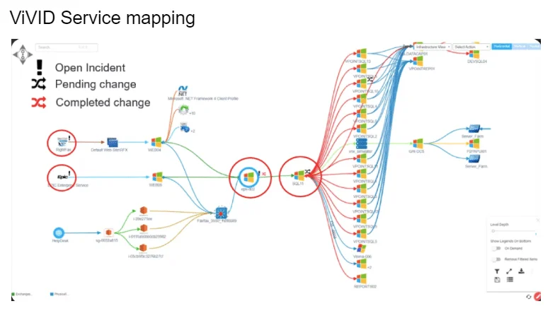 - Integrate with ITSM to see open incidents, pending changes and recently completed changes within the ViVID maps