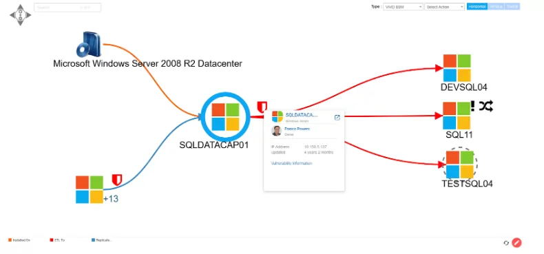 The Virima Visual Impact display is a culmination of automated discovery and human intelligence to produce dynamic visualizations of complex application dependency and infrastructure relationships. These relationships are contextualized in a sort of heads up display useful for effective incident and change management, prioritization of vulnerabilities, disaster recovery planning and audit support.
