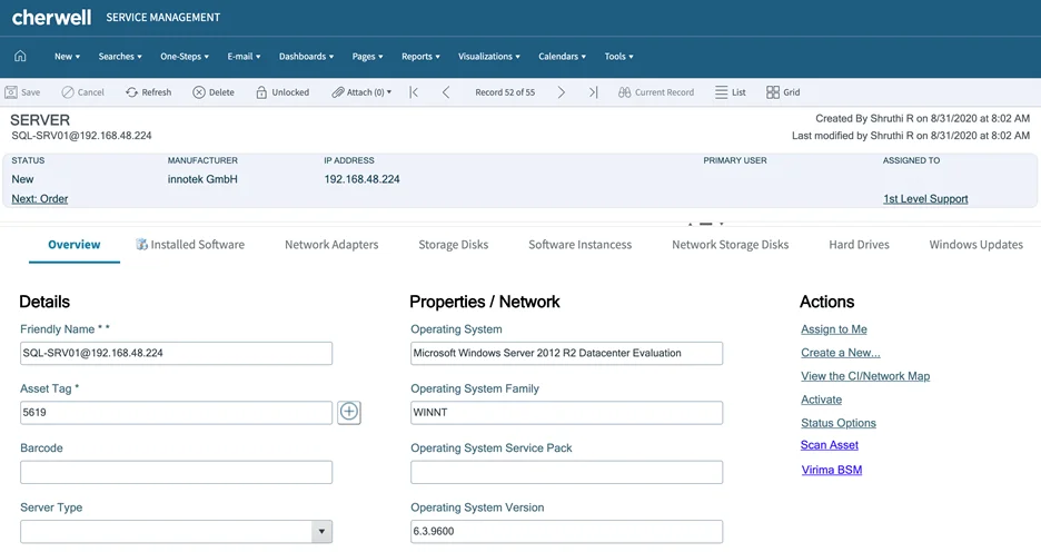 Within the Cherwell CMDB all synched assets and configuration properties are viewable from the Cherwell web client and desktop agent. New action links automatically appear in the Cherwell CMDB record providing ITSM users the ability to rescan the asset and view available Virima dependency and relationship maps.